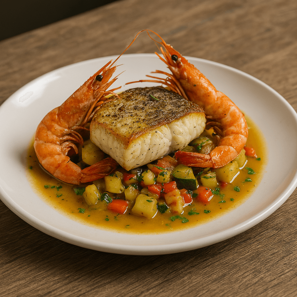 Delicioso lomo de merluza perfectamente sellado, acompañado de dos langostinos al vapor y un salteado de verduras frescas en su propio jugo. Un plato que fusiona sabor, color y frescura mediterránea.