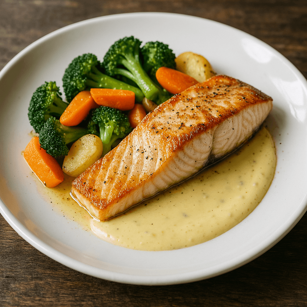 Disfruta de un filete de salmón jugoso y dorado, servido sobre una suave salsa de mostaza, acompañado de una selección de verduras frescas al vapor. Ligero, saludable y lleno de sabor.